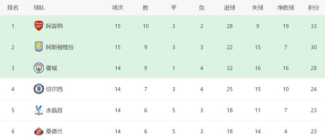 随着曼城、切尔西、利物浦众多强队发挥不稳,阿森纳在积分榜上稳居榜首,14轮过后握有5分领跑优势。